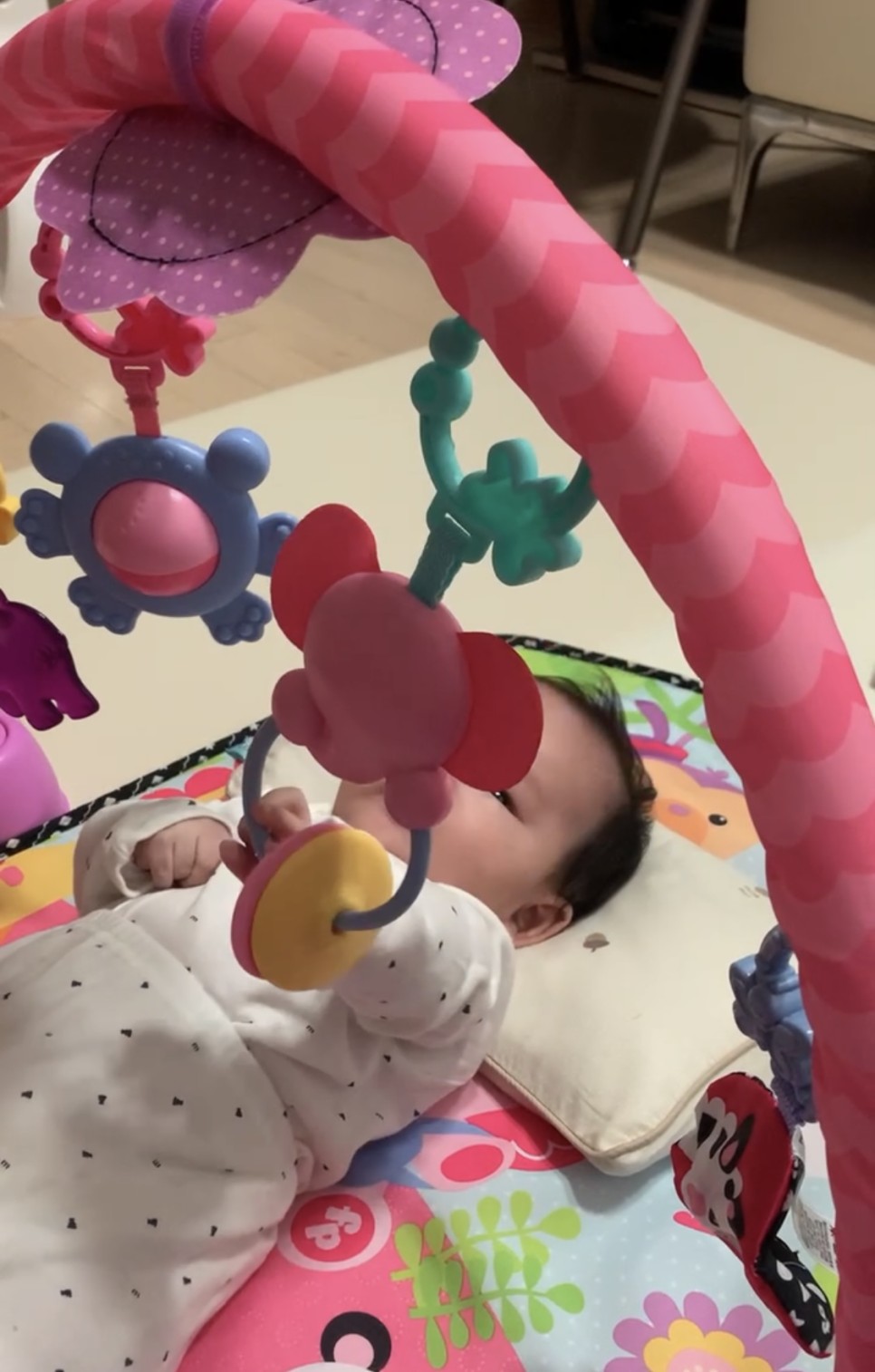 비닐 소리가 나는 장난감을 가장 오래 가지고 놀았고, 딸랑이와 돌아가는 장난감까지 정말 잘 가지고 놀았어요. 딱 아기가 손을 뻗으면 닿을 위치에 장난감이 있기도 하고, 아기 손에 잘 맞는 크기여서 어린 시절 소근육 발달에 큰 도움이 되는 아이템이에요.