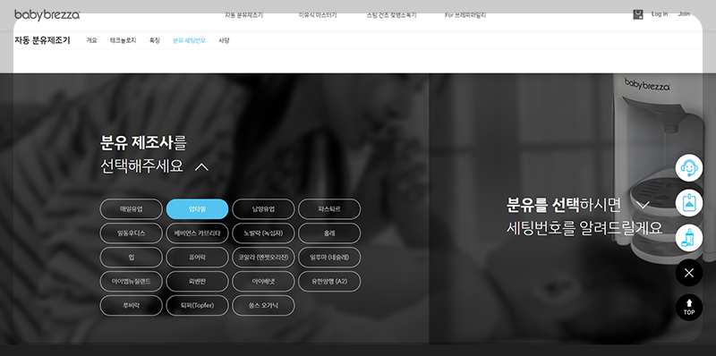 베이비 브레짜는 어떤 분유를 넣어도 각 분유의 특성에 맞게 알아서 제조를 해줘요. 그런데 각 브랜드마다 분유의 굵기나 물에 녹는 정도가 다르기 때문에 최초에는 설정을 해줘야 돼요. 먼저 베이비 브레짜 공식 홈페이지에 접속해야 하는데요. 아래 버튼을 클릭하시면 브랜드별 베이비 브레짜 세팅 번호를 확인할 수 있는 페이지로 연결 돼요.
