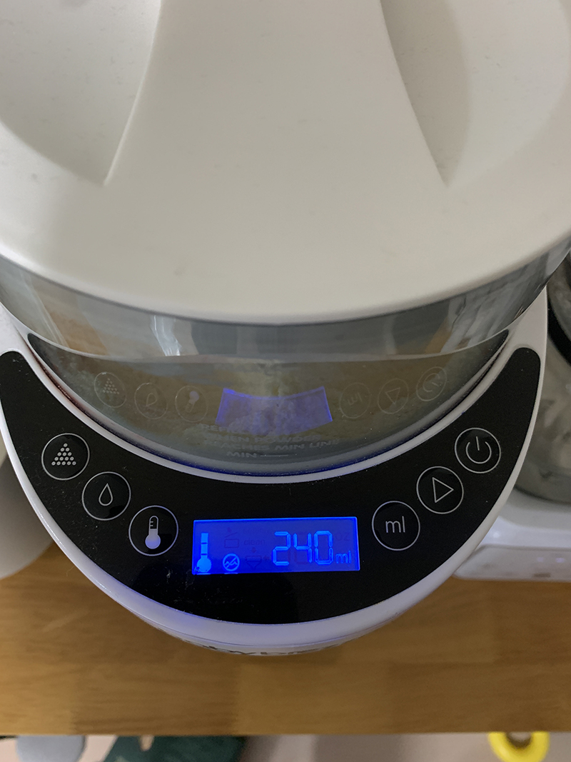4. 가장 많이 사용하는 버튼 중에 하난데요. 분유의 양을 설정할 수 있어요. 아기가 매번 배가 고플 때마다 같은 양을 먹는 게 아니다 보니, 경우에 따라 양을 조정해줘야 해요. 최소 60ml부터 세팅이 가능한데요. 아기가 커감에 따라 전체 수유의 양도 달라지니 아기가 먹는 양을 점검해 가면서 세팅하면 돼요.